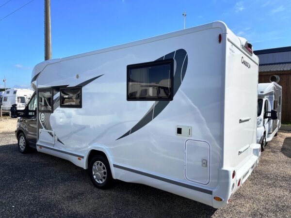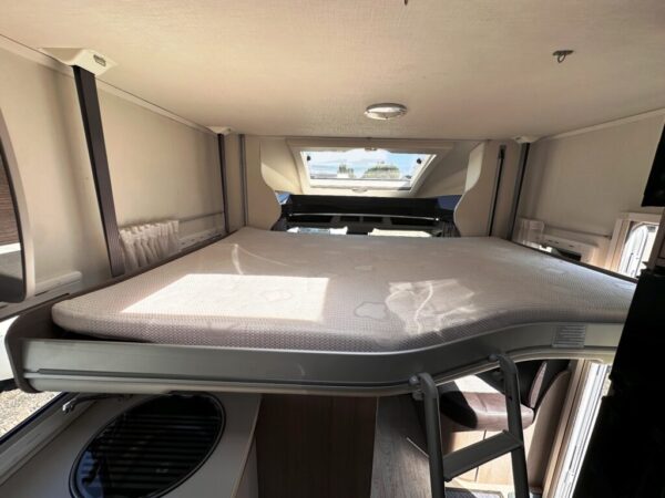 Profilé Chausson Flash 718 XLB de 7,49 m, 4 couchages avec lit de pavillon électrique et chambre arrière. Équipé de chauffage diesel Truma, panneau solaire, GPS Camper, caméra de recul, antenne satellite auto. Moteur Ford 155 CV, 32 500 km. Garantie 3 mois incluse.