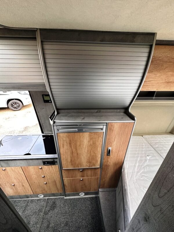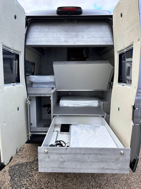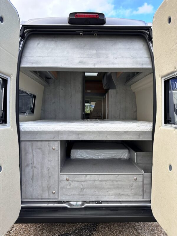 Lit fixe arrière (grand confort) installé sur une grande soute de rangement
